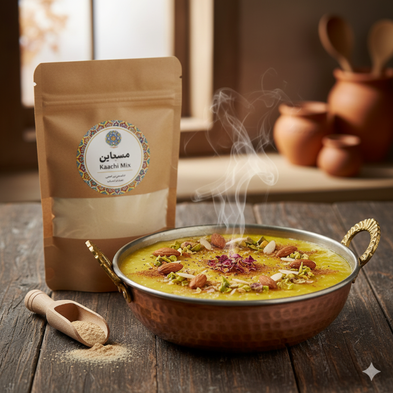ترکیب: ترکیبات پودر کاچی (شامل آرد گندم، هفده ادویه مخصوص، مغزیجات مختلف و سایر مواد اولیه)