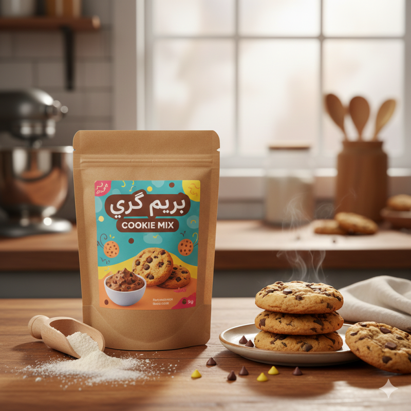 ترکیب: ترکیبات پودر کوکی شکلات چیپسی (شامل آرد، شکر، شکلات چیپسی، بیکینگ پودر و سایر مواد اولیه)